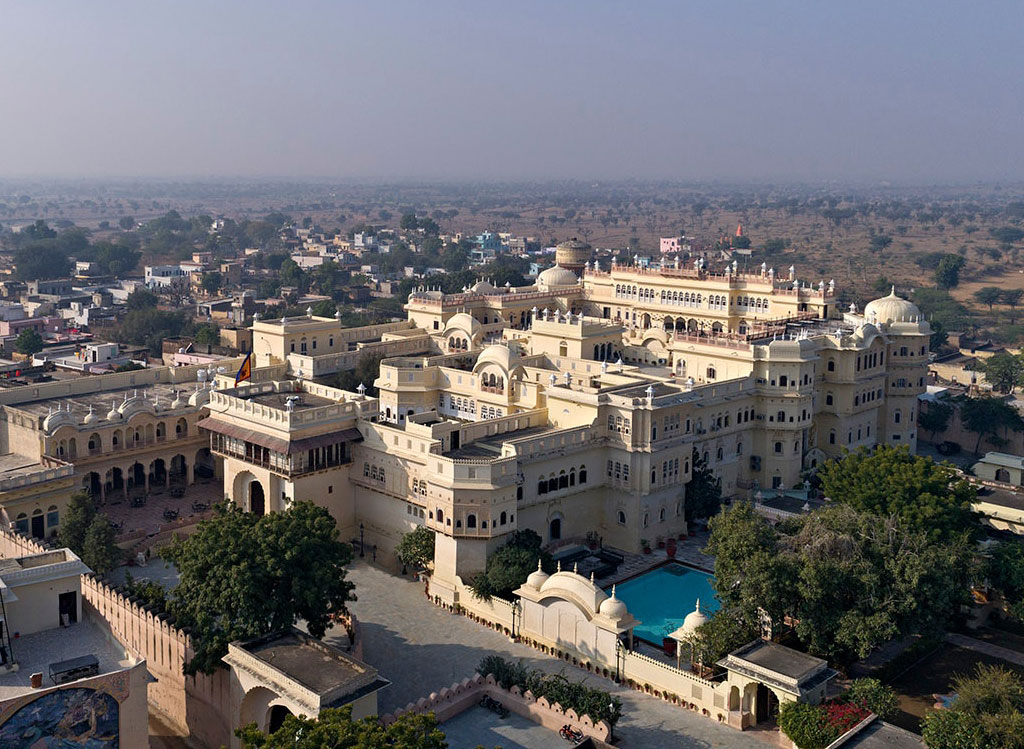 This 17th-century palace offers guests a regal experience with its grand courtyards, intricately carved walls, and lavishly decorated rooms and suites. Each room is adorned with traditional Rajasthani decor, antique furniture, and contemporary amenities to ensure a comfortable stay. The palace's open spaces, including its sprawling courtyards and rooftop terraces, offer breathtaking views of the surrounding village and desert landscape.