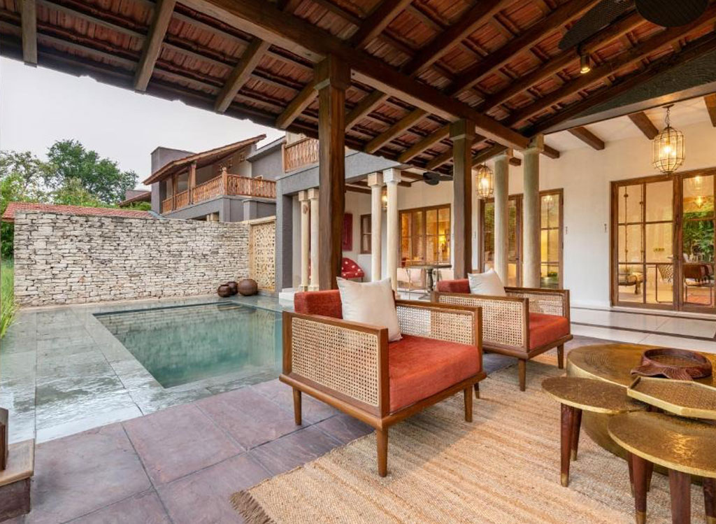 With just 18 standalone “kothis”—including single- and double-bedroom units—each features a courtyard, upper deck veranda, and private plunge pool. Crafted from local stone, reclaimed wood, and adorned with traditional Lippan mirror work, the interiors reflect both Gujarati heritage and modern elegance.